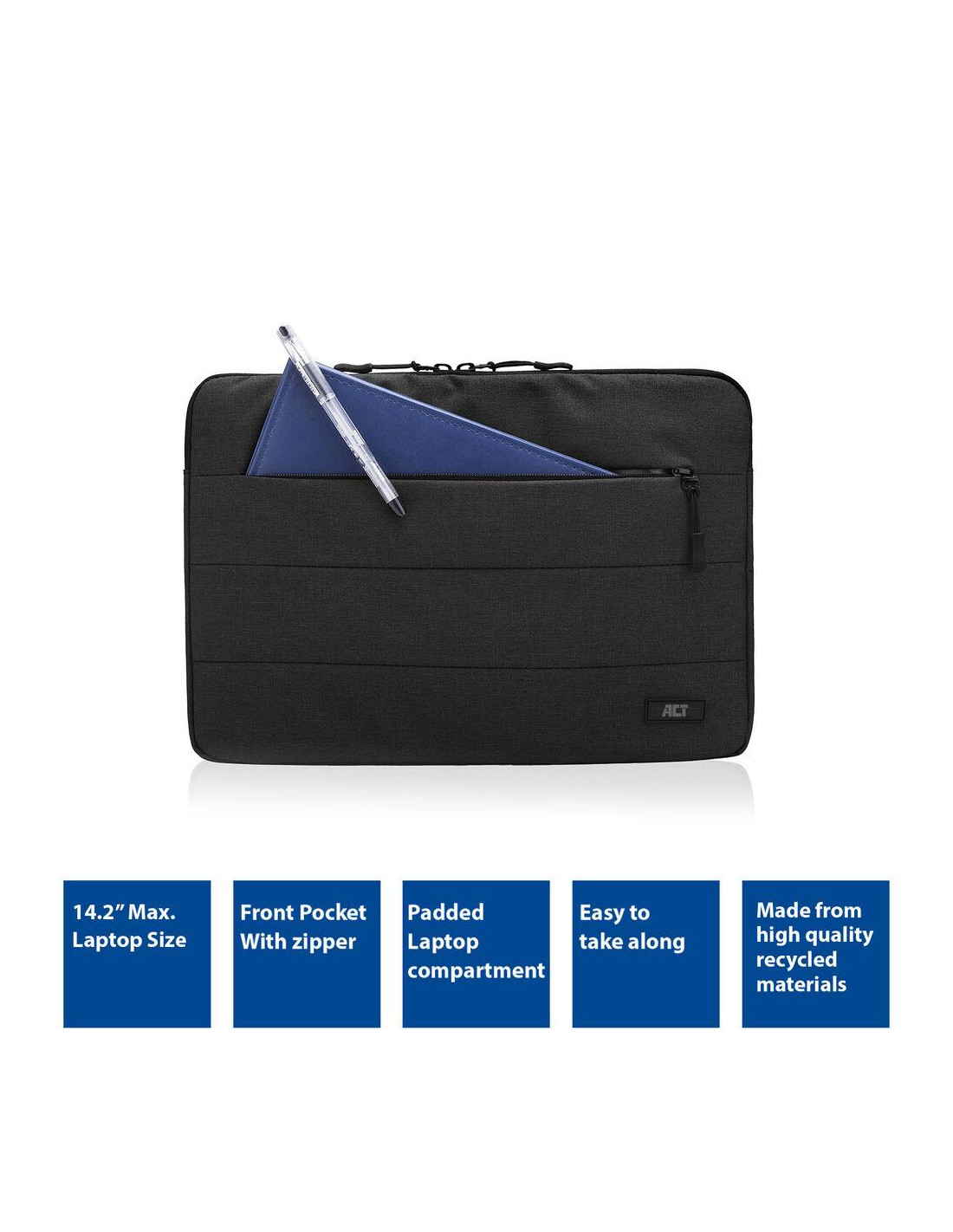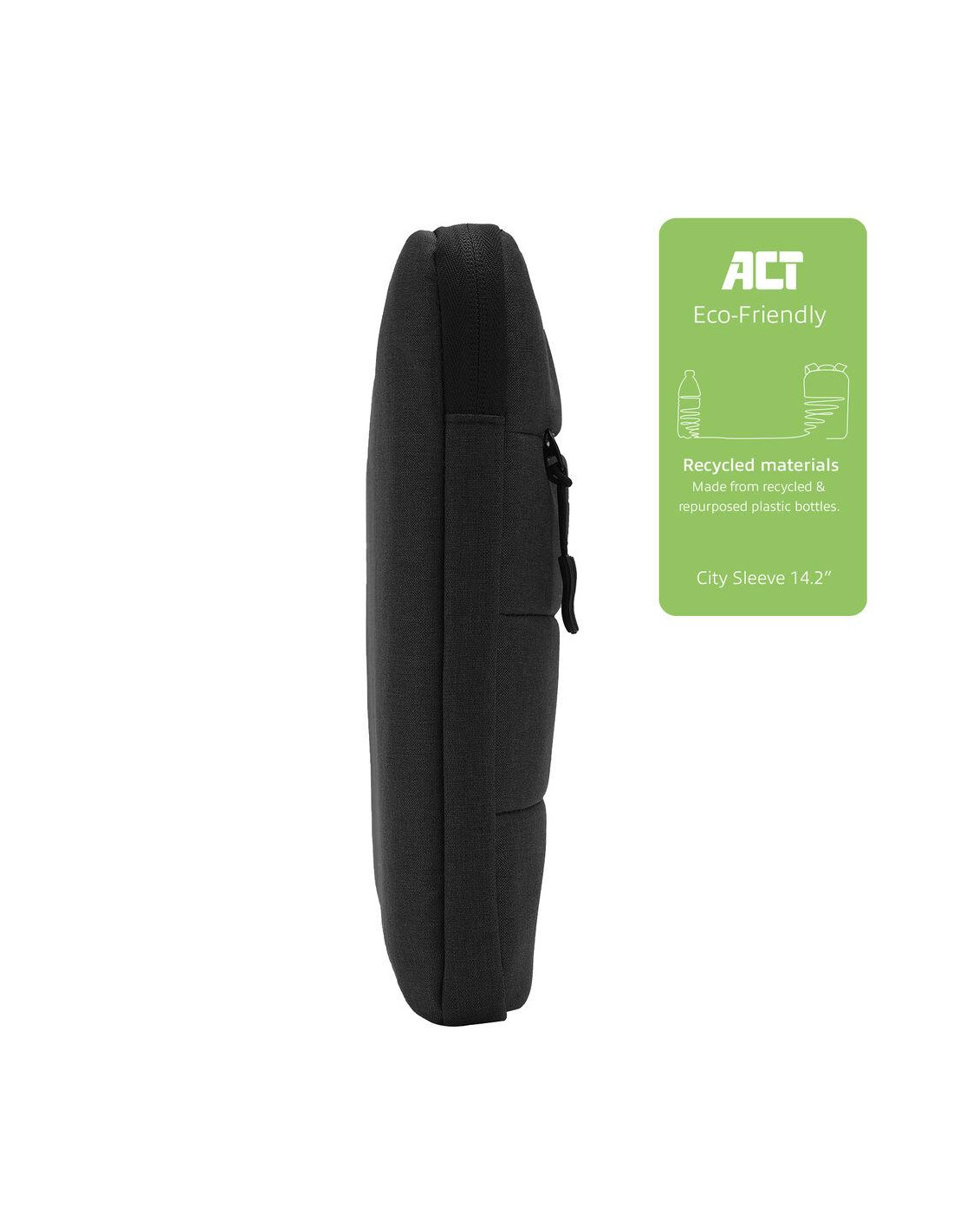 Защитете лаптопа си с калъфа за лаптоп ACT AC8515 City за лаптопи до 14,2 инча. Този лек калъф предлага място за вашия лаптоп и допълнително за вашия таблет, захранващ адаптер, мишка и други периферни устройства. Калъфът е изработен от rPET материал.