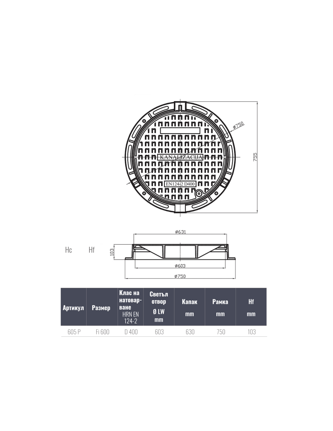 Чугунен капак Ø600 D400 /P/ H100 плътен /RUBIN 2001/