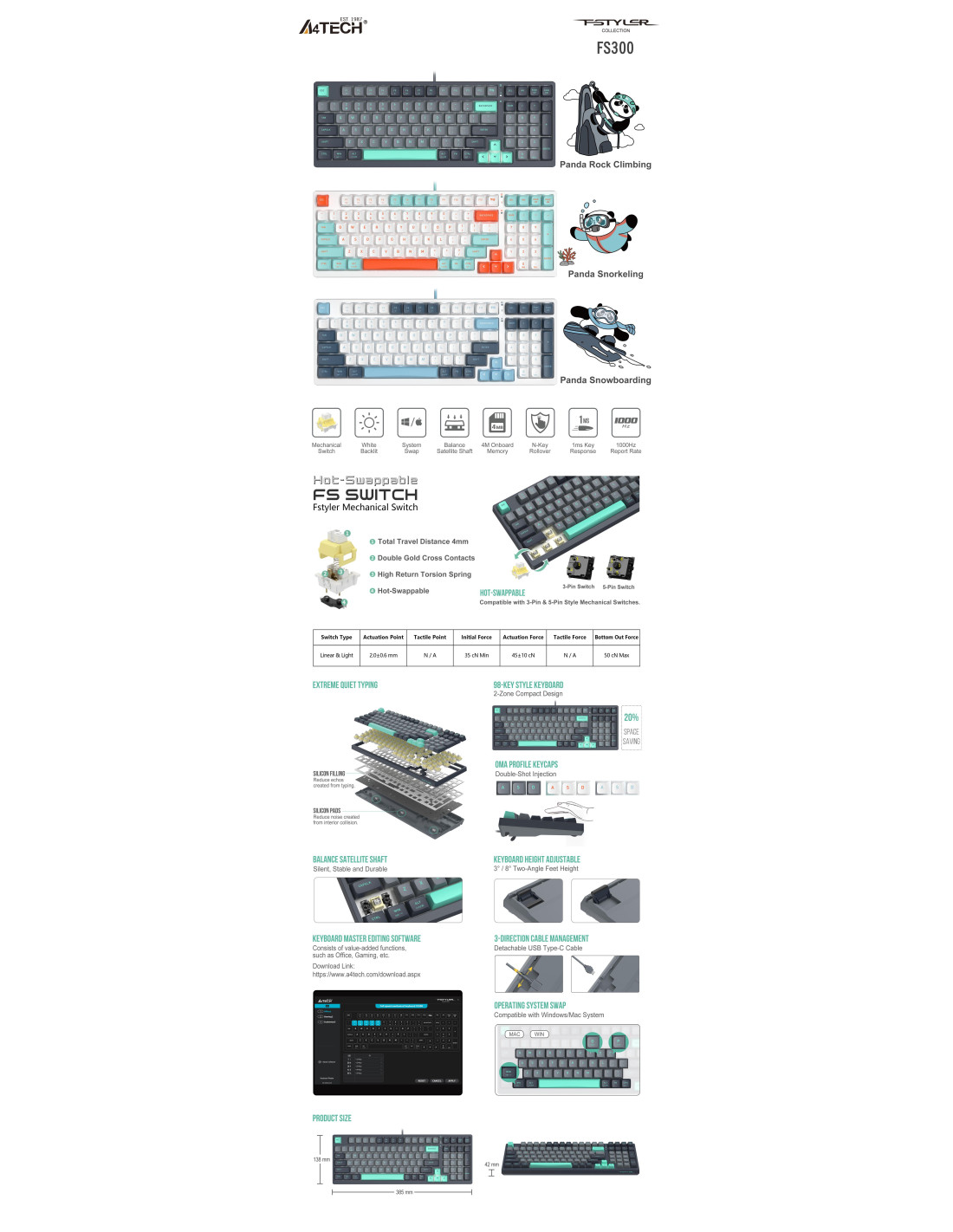 Клавиатурата A4Tech Fstyler FS300 е механична, с гореща замяна на превключвателите (Hot-Swap) и 98 клавиша, което я прави компактна, но функционална. Ето някои от основните ѝ характеристики: