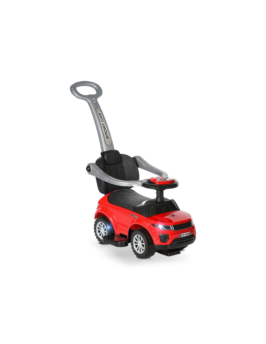 светещ музикален панел- 3 детски песни (английски език) и звук на клаксон,волан за управление,багажник,облегалка,отстраняема дръжка за родителски контрол,отстраняеми прегради за безопасност,отстраняема поставка за крачета,възможност за стопиране на управлението на волана от детето при използване на дръжката за родителски контрол,стопери против преобръщане,размери: 85х43х85,5 см,размери: 52x25x35,5 см///
