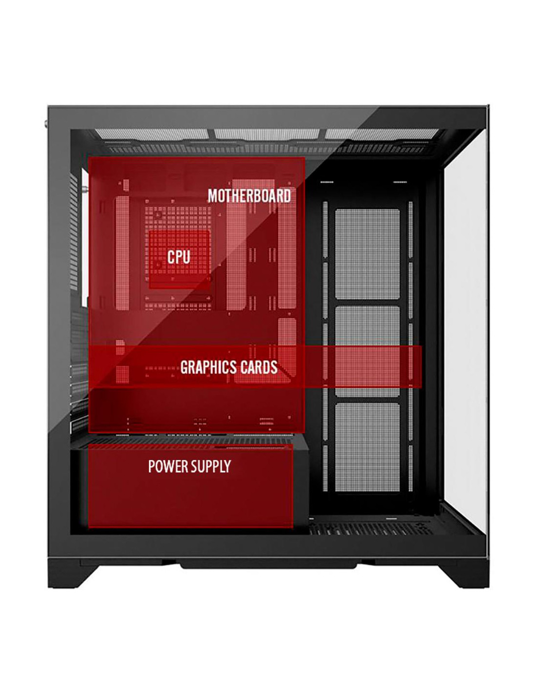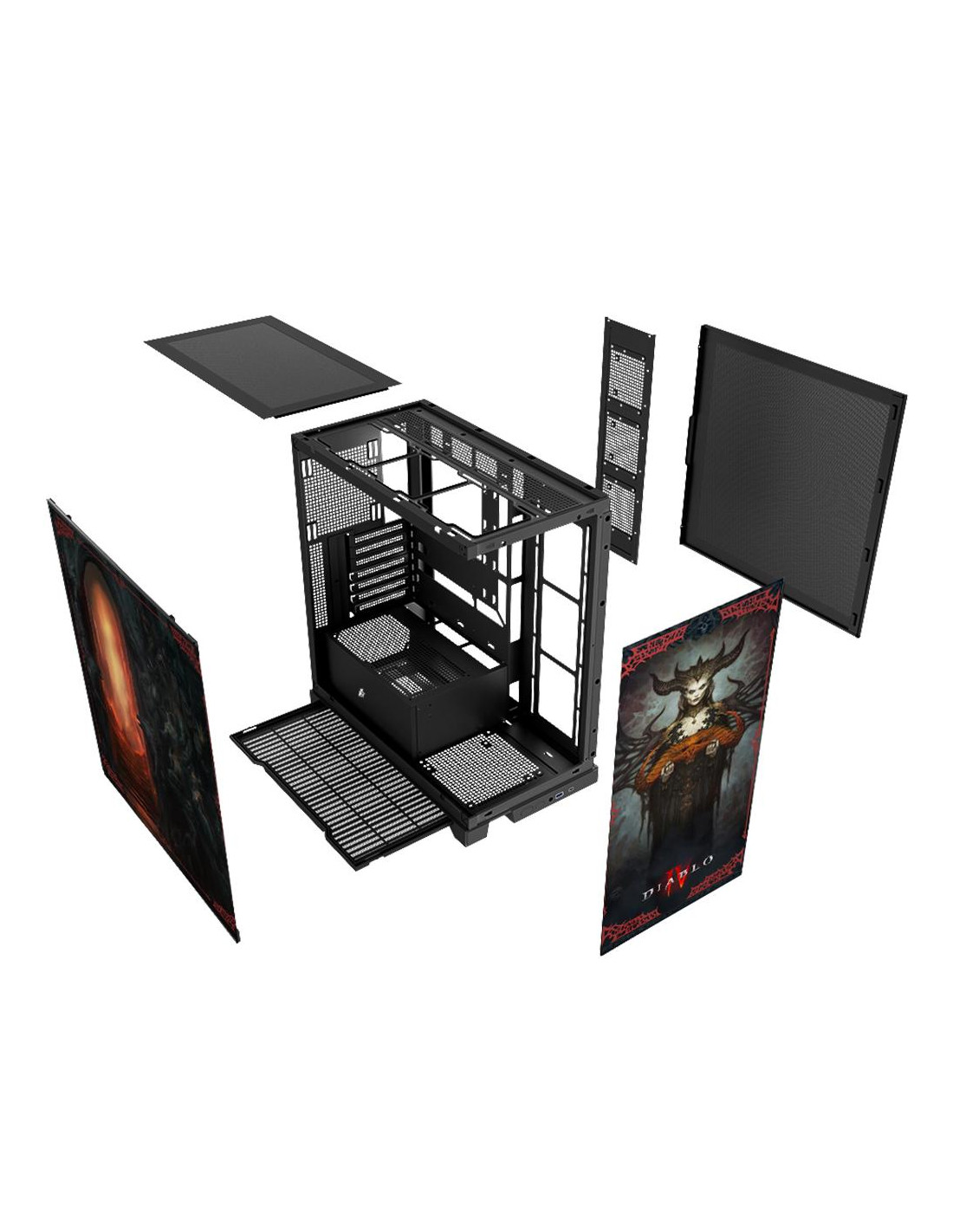 Стилен, персонализиран корпус, вдъхновен от легендарната игра Diablo IV – идеален за допълване на тъмна, атмосферна гейминг конфигурация. С добре планирано осветление, дизайнът оживява в зловещи, огнени нюанси, подчертавайки смелата и потапяща естетика. Освен впечатляващия външен вид, корпусът предлага и отлична функционалност: поддръжка за водно охлаждане отгоре и отзад, ефективно управление на кабели, 360-градусова циркулация на въздуха и просторно вътрешно пространство за гъвкава хардуерна конфигурация.