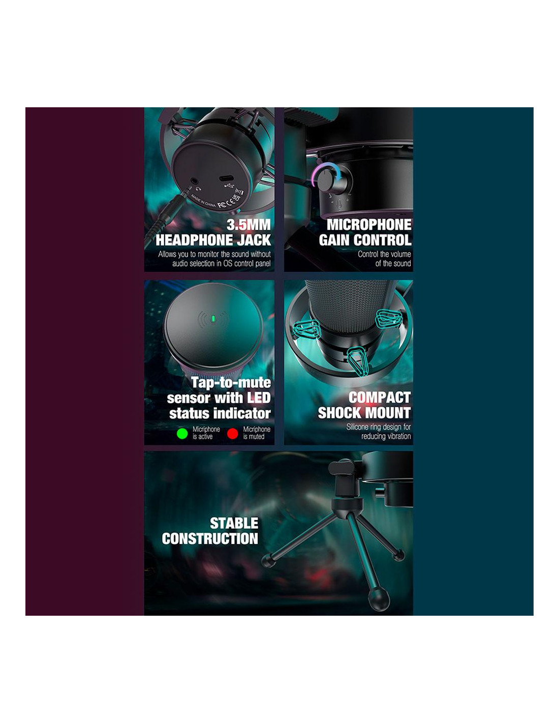 Контрол на звука в реално време: С 3.5 мм жак за слушалки можете директно да следите нивата на звука и да регулирате входната сила без нужда от клавишни комбинации. С едно докосване на бутона за заглушаване предотвратявате нежелани звуци да достигнат до вашата аудитория.