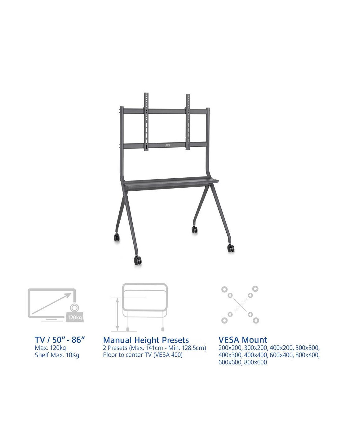 Стойката е проектирана с мисъл за съвременните конферентни нужди. Тя разполага с две регулируеми нива на височина, което позволява адаптиране на екрана спрямо публиката – независимо дали тя е седяща или правостояща. Вградената поставка за мултимедийни устройства (лаптоп или плейър) и горният рафт за видеоконферентна камера правят инсталацията компактна и подредена. За разлика от стандартните статични стойки, този модел предлага свобода на движение и универсална съвместимост с широк спектър от VESA стандарти, което го прави дългосрочна инвестиция за всяка модерна организация.