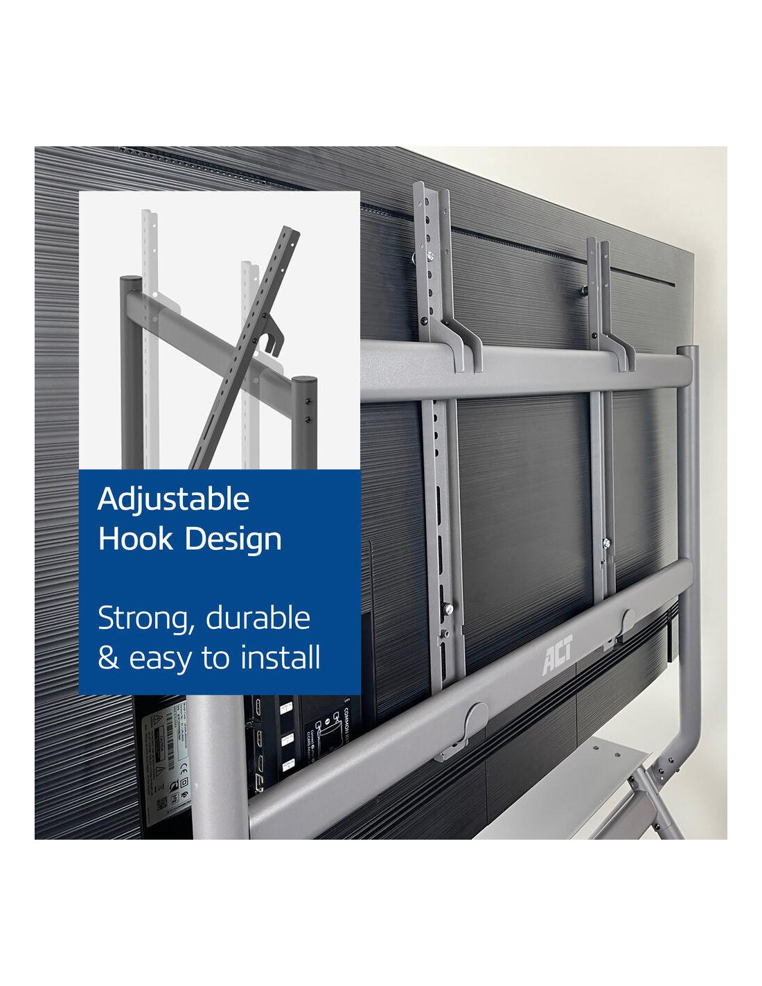 Масивната стоманена стойка е проектирана за безопасно и лесно преместване на екрани с големи диагонали от 50 до 86 инча. Със своята изключителна товароносимост до 120 кг, тя е идеалното решение за професионална употреба в корпоративни зали, образователни центрове и изложбени пространства, където стабилността и мобилността са от критично значение.