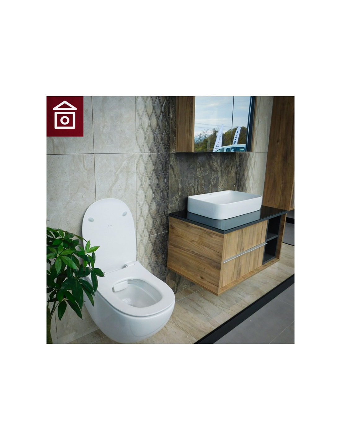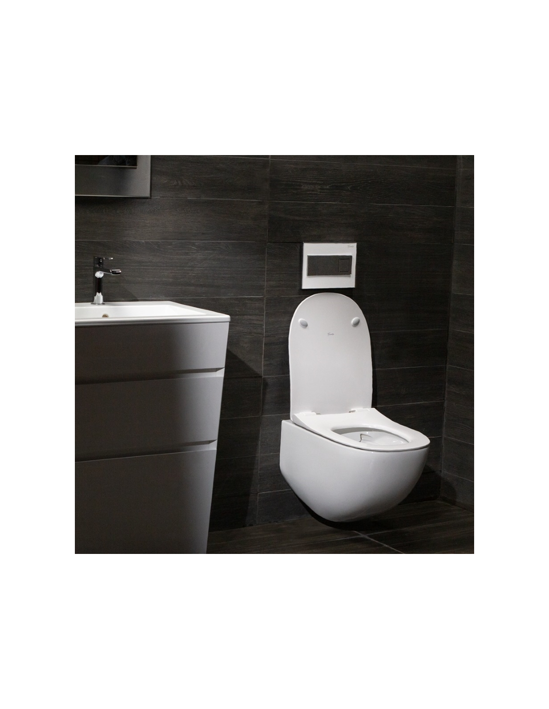 Висяща тоалетна Fluenta Rimless с елегантен и модерен дизайн, и капак Slim със забавено падане.