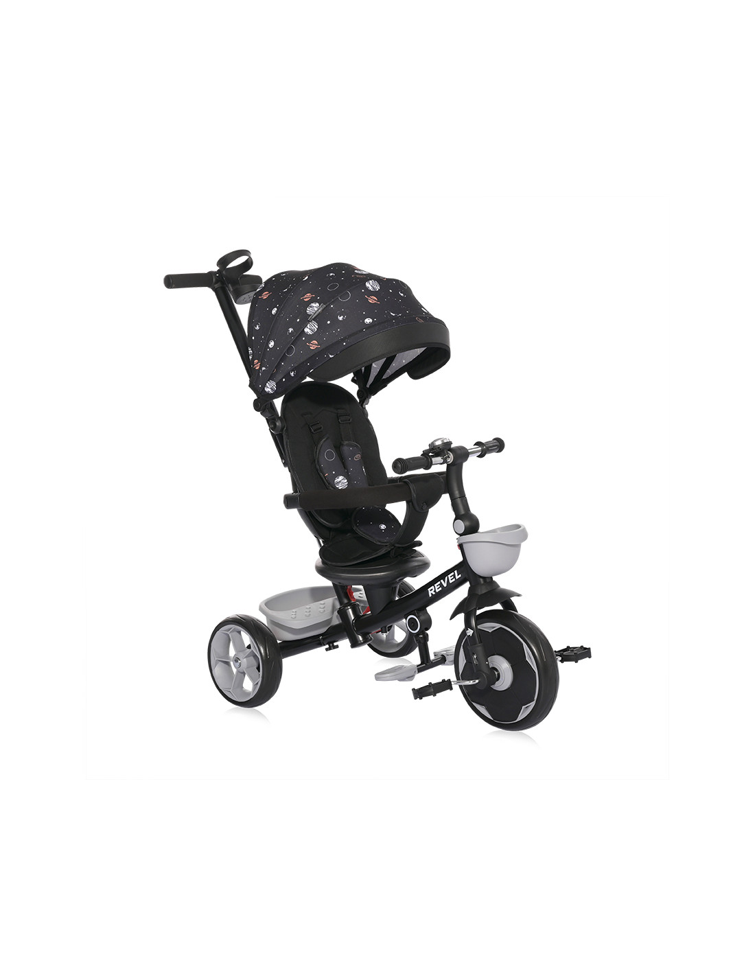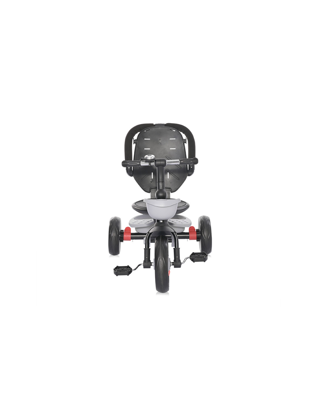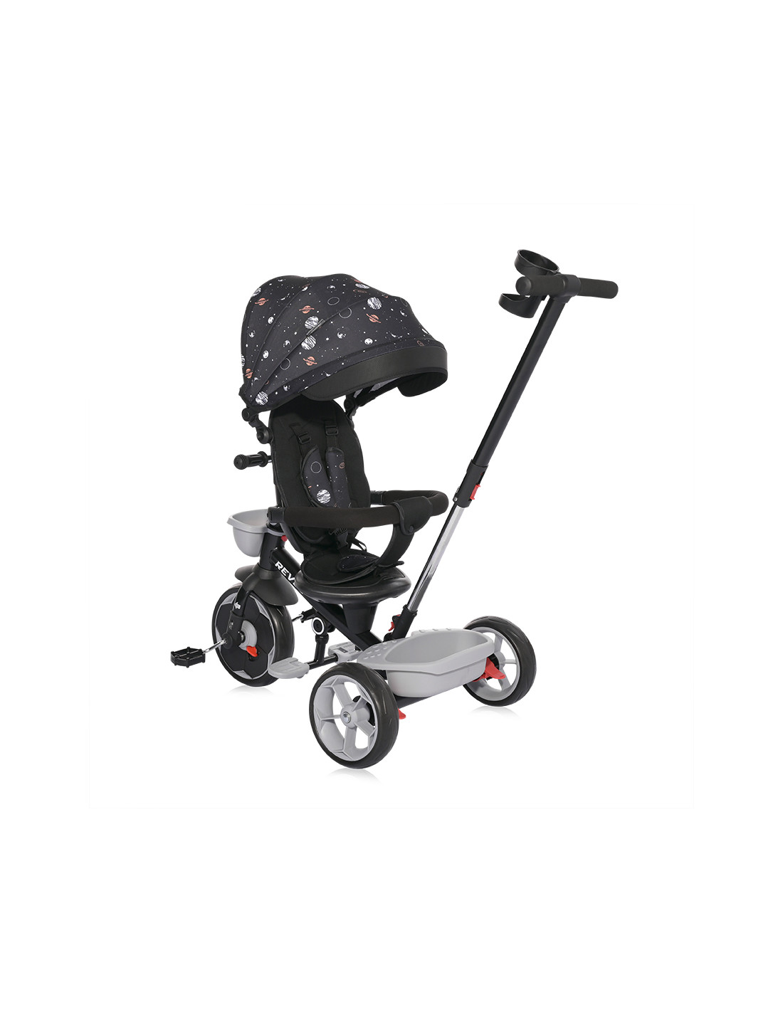 сгъваем сенник,звънец,мека седалка,спирачки на задните колела,тапицирана облегалка,педали,сгъваема поставка за крачета,бутон за завъртане на седалката,позиция: с гръб към родителя,позиция: с лице към родителя,позиция: родителски контрол,пластмасова поставка за чаша или шише,пластмасов багажник,2 позиции за регулация на височината на дръжката за родителски контрол,отстраняема тапицерия за лесно почистване,триколка - колело,въртяща се седалка за комуникиране с родителя “лицe в лице” - 360° ротация,предно кошче за поставяне на бутилка,отстраняем гриф,вкл./изкл. на механизма за свободно движение,EVA гуми,дъждобран за триколка /не е включен/,Сгъване на кормилото,Сгъваема седалка,максимално тегло 25 кг.,Предна гума: 11 инча,Задни гуми: 9 инча///