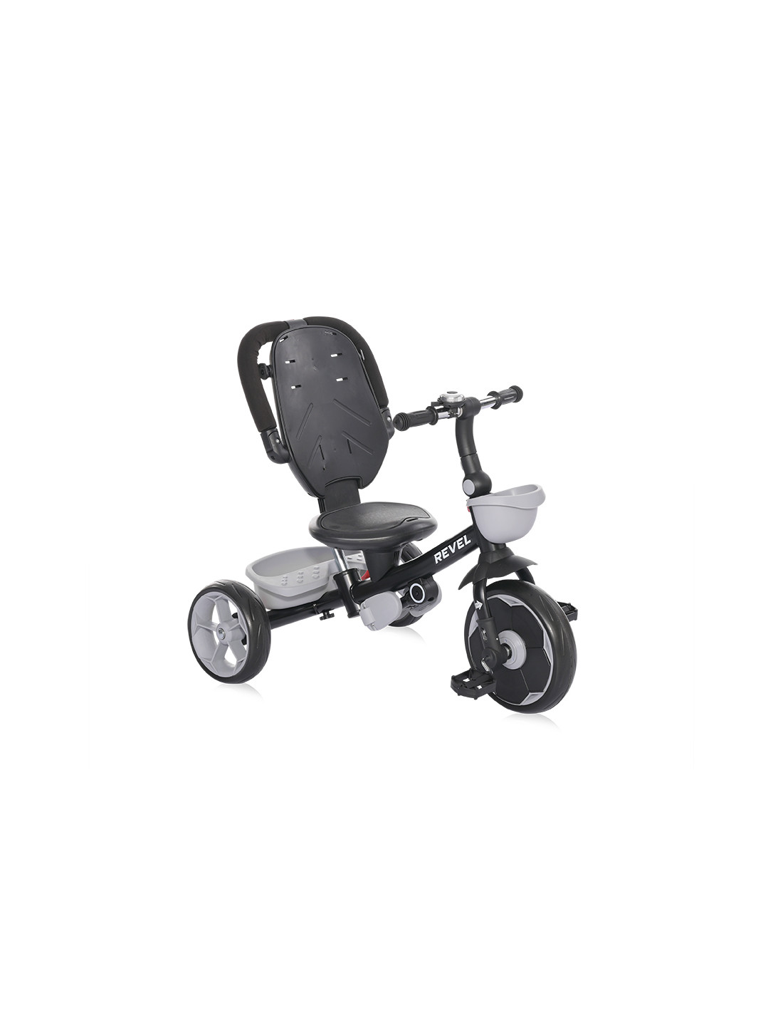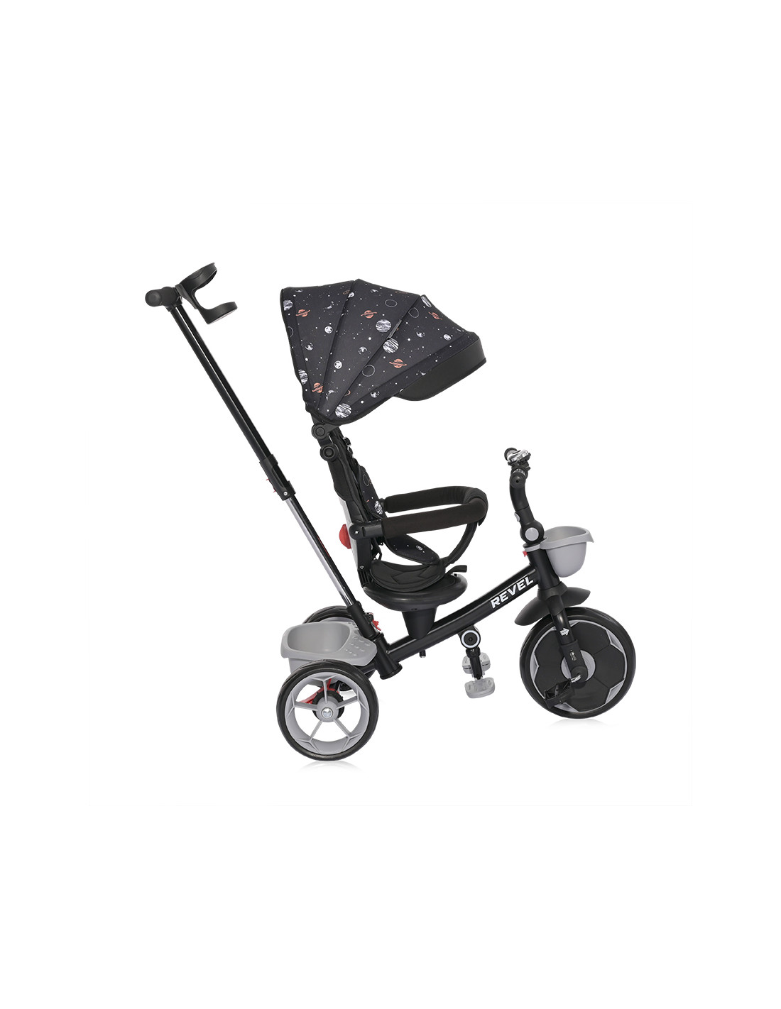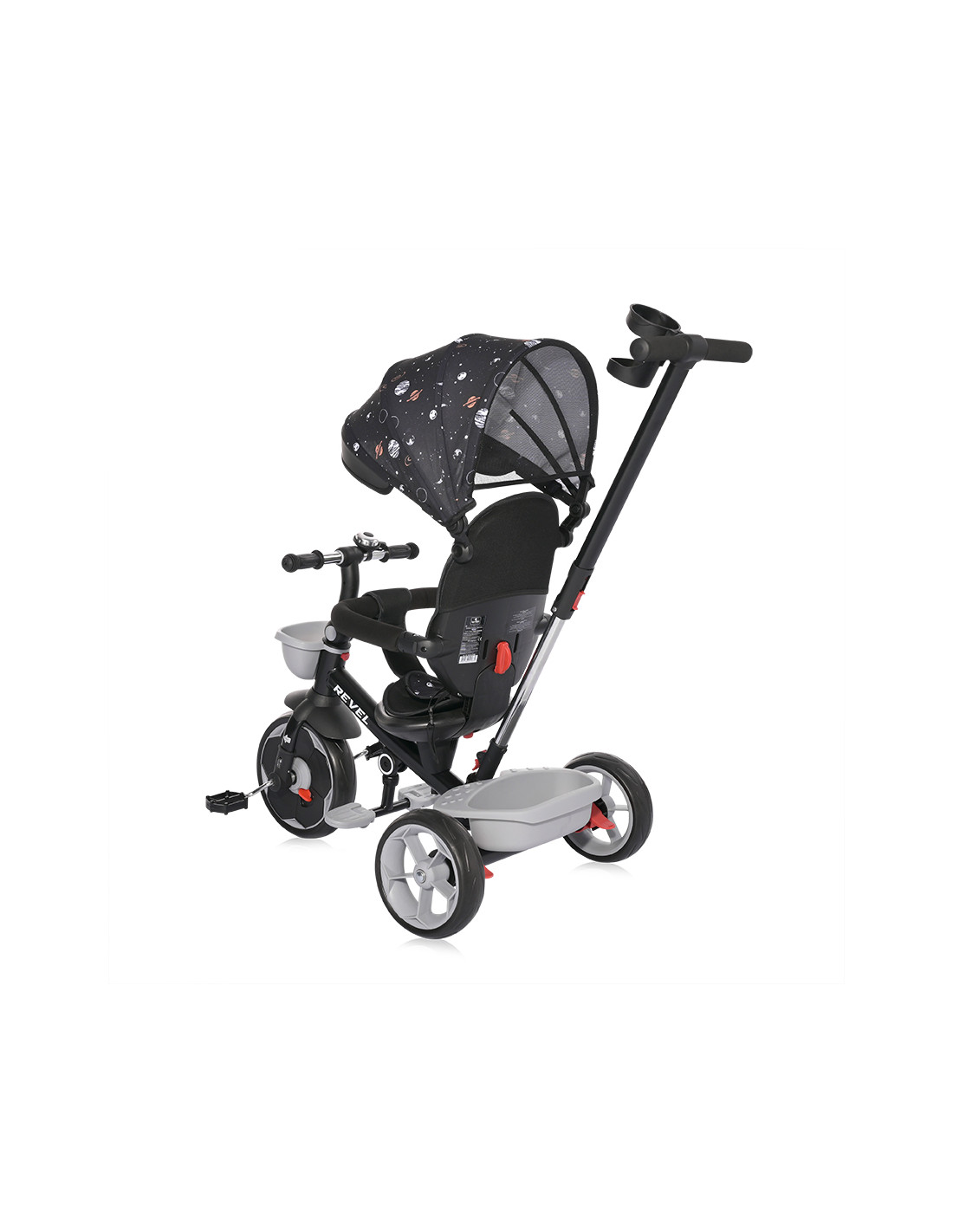 сгъваем сенник,звънец,мека седалка,спирачки на задните колела,тапицирана облегалка,педали,сгъваема поставка за крачета,бутон за завъртане на седалката,позиция: с гръб към родителя,позиция: с лице към родителя,позиция: родителски контрол,пластмасова поставка за чаша или шише,пластмасов багажник,2 позиции за регулация на височината на дръжката за родителски контрол,отстраняема тапицерия за лесно почистване,триколка - колело,въртяща се седалка за комуникиране с родителя “лицe в лице” - 360° ротация,предно кошче за поставяне на бутилка,отстраняем гриф,вкл./изкл. на механизма за свободно движение,EVA гуми,дъждобран за триколка /не е включен/,Сгъване на кормилото,Сгъваема седалка,максимално тегло 25 кг.,Предна гума: 11 инча,Задни гуми: 9 инча///