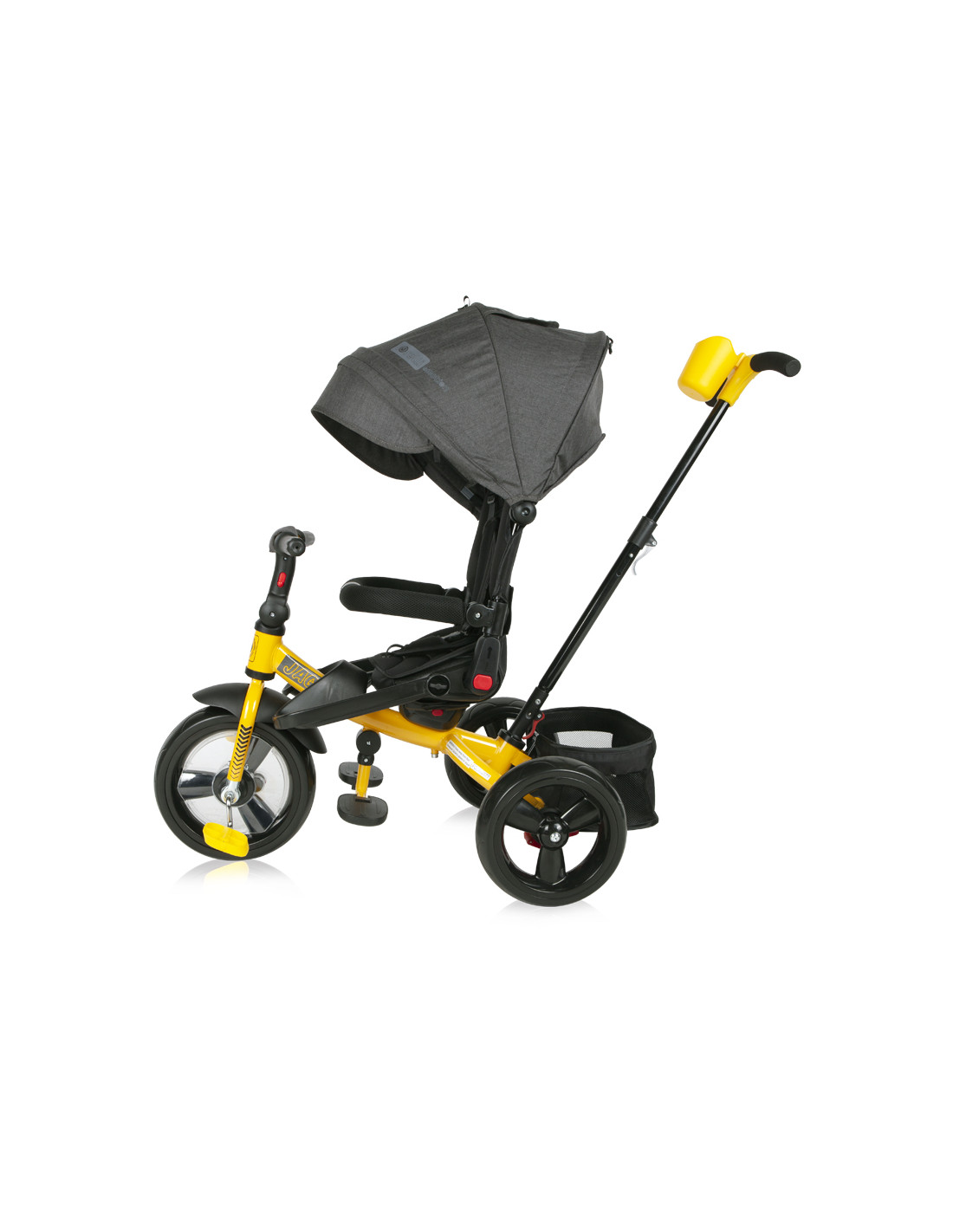 сгъваем сенник,прозорче на сенника,багажник,регулируема и комфортна облегалка,отстраняем гриф,сгъваема поставка за крачета,бутон за стопиране движението на педалите на предното колело,поставка за крачета за по-малки деца,бутон за завъртане на седалката,позиция: с гръб към родителя,позиция: с лице към родителя,позиция: родителски контрол,триколка,пластмасова поставка за чаша или шише,предпазни колани,Бутон за регулация на кормилото,Цип на сенника за отстраняване на козирката,Индивидуални спирачки на задните колела,2 позиции за регулация на височината на дръжката за родителски контрол,Скрит вътрешен механизъм за родителски контрол на предното колело,органайзер с джобове на гърба,изцяло премахваща се тапицерия за лесно почистване,дъждобран за триколка /не е включен////