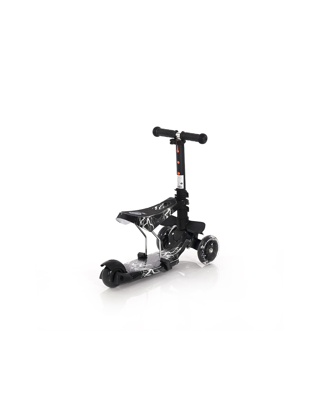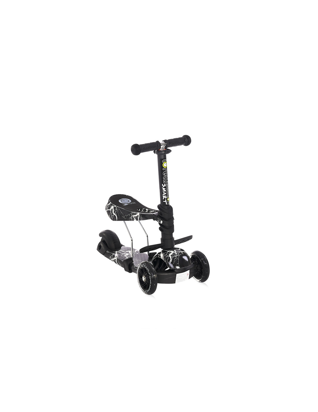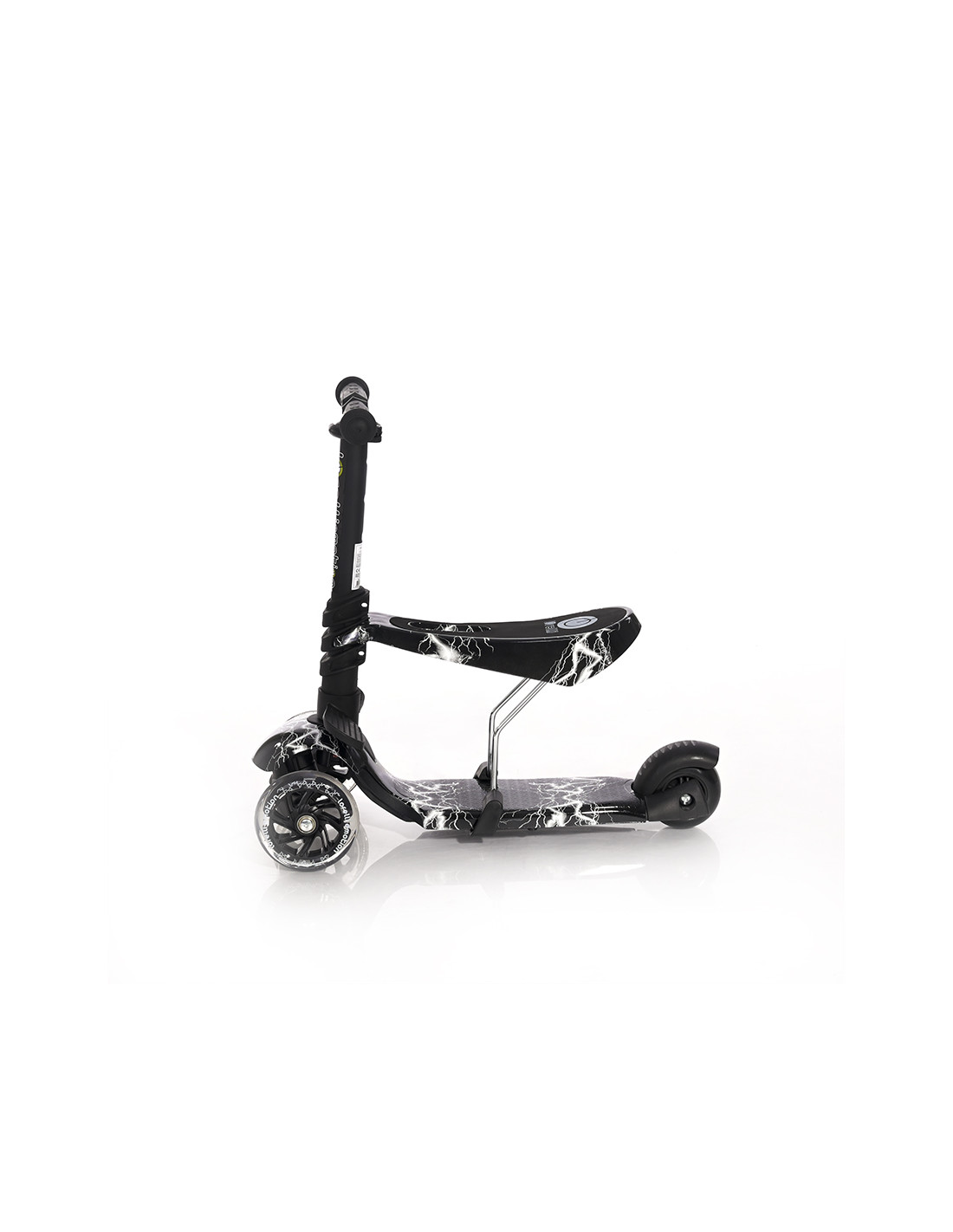 крачна спирачка,висококачествени лагери ABEC-7,TPR ръкохватки,предни полиуретанови гуми със светлина 120/28 mm,максимално тегло - 20 kg,полипропиленова платформа с размер: 350/120 mm,заднa pvc гумa 100/48 мм,сгънато положение,цветна кутия,стъпенка,седалка,регулируема дръжка в 3 позиции,Светещи гуми///