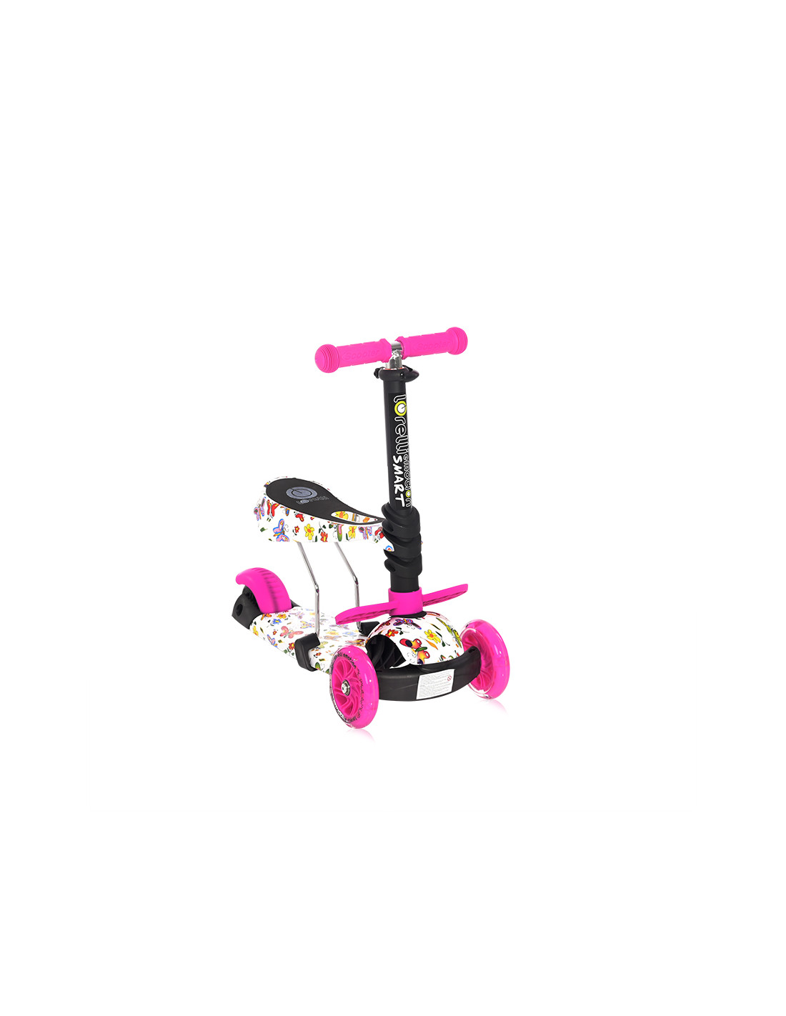 крачна спирачка,висококачествени лагери ABEC-7,TPR ръкохватки,предни полиуретанови гуми със светлина 120/28 mm,максимално тегло - 20 kg,полипропиленова платформа с размер: 350/120 mm,заднa pvc гумa 100/48 мм,сгънато положение,цветна кутия,стъпенка,седалка,регулируема дръжка в 3 позиции,Светещи гуми///